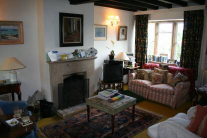 Open hearth fire place with carved stone surround. Two arched display alcoves. Beamed ceiling. Electric night store heater.