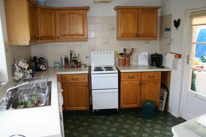 Oak fronted floor and wall units. Single stainless single drainer sink unit. Electric cooker and oven, fridge, electric night storage heater, plumbing for dishwasher.